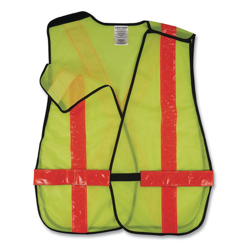 To ensure you stand out against your backdrop, GloWear® 8080BAX Safety Vests feature bright, high-visibility colors enhanced with sewn-on, two-inch-wide reflective-tape stripes—a dual-cross on front and an X on back. Durable, lightweight polyester mesh front and back stand up to just about anything a work area can dish out while helping the wearer stay cool on even the hottest days. Easy-on, easy-off design features break-away shoulders for added safety when working around machinery. Open sides along with a hook-and-loop closure make it easy to get the right fit.Note: This is a non-returnable item.