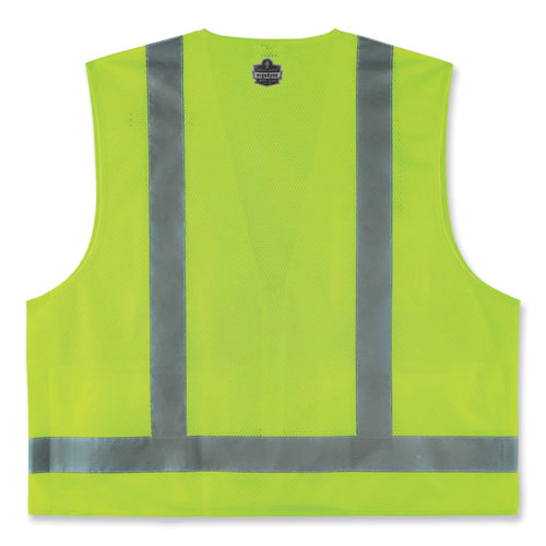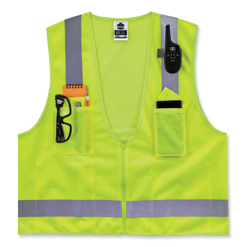 The GloWear 8249Z Surveyors Vest is an ANSI 107 Type R, Class 2 economy vest with a 3.6 oz polyester solid front and breathable 3.3 oz polyester mesh back. This hi-vis vest features 2" reflective tape for enhanced low-light visibility. With two interior and two exterior pockets, including a cell phone chest pocket, this vest provides ample storage for pens, notebooks, tablets and more. A single mic tab allows convenient radio access, and a zipper closure makes for easy on and off.Note: This is a non-returnable item.