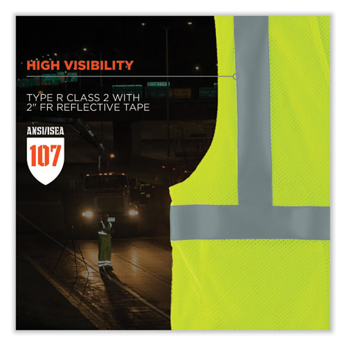 The GloWear 8263FRHL FR Safety Vest is a Type R Class 2 vest compliant to ASTM F1506 for flame resistance. Designed to be worn as part of a complete fire-resistant (FR) garment system, this ANSI-approved mesh work vest is tested and certified to an ATPV 5.1 cal/cm˛, NFPA 70E CAT 1. FR and ANSI 107 Compliant. Made of 60% modacrylic mesh and 40% cotton for comfort and breathability. This reflective vest also features a 2" FR reflective tape for heightened visibility at night or in low-light environments. Includes one interior pocket, one dual pen pocket and a single flame-resistant radio mic tab. D-ring access on the back for wearing over fall protection harnesses, and a hook and loop closure for easy on/off. This FR high-visibility vest is ideal for workers in occupations with electrical arc flash risk, including electrical and utilities.Note: This is a non-returnable item.