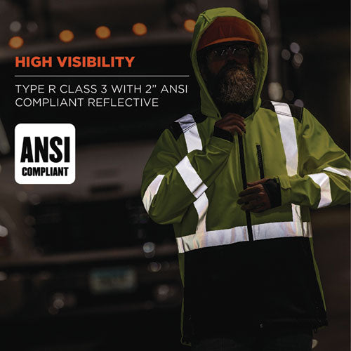 The GloWear 8353 Hi-Vis Softshell features a 100% polyester shell with PU coating for water- and wind-resistant protection from the elements. A soft polar fleece lining adds warmth and comfort for cool environments and thumb loops trap heat and keep sleeves in place. Unlike typical boxy and bulky hi-vis gear, this lightweight jacket is designed for a more athletic fit.Note: This is a non-returnable item.