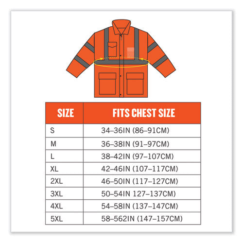 The GloWear 8365 Hi-Vis Rain Jacket is a Type R, Class 3 jacket that offers waterproof, breathable protection against the elements. Made with a breathable polyester shell that keeps water out while letting moisture escape to keep you cool and comfortable working in the worst conditions. This reflective rain jacket has 2 ANSI compliant 3M Scotchlite Reflective material on the chest and arms for added visibility at night or in low-light conditions. The inset hood can be tucked away when not needed. This waterproof work jacket offers comfortable protection against the elements for those working in road construction, utilities, construction, emergency response, airline, railway or survey crews.Note: This is a non-returnable item.