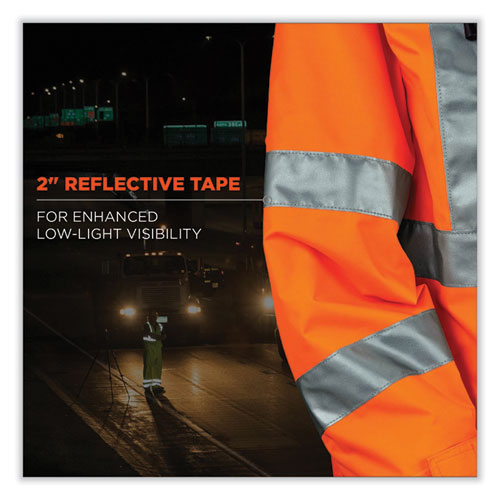 The GloWear 8365 Hi-Vis Rain Jacket is a Type R, Class 3 jacket that offers waterproof, breathable protection against the elements. Made with a breathable polyester shell that keeps water out while letting moisture escape to keep you cool and comfortable working in the worst conditions. This reflective rain jacket has 2 ANSI compliant 3M Scotchlite Reflective material on the chest and arms for added visibility at night or in low-light conditions. The inset hood can be tucked away when not needed. This waterproof work jacket offers comfortable protection against the elements for those working in road construction, utilities, construction, emergency response, airline, railway or survey crews.Note: This is a non-returnable item.