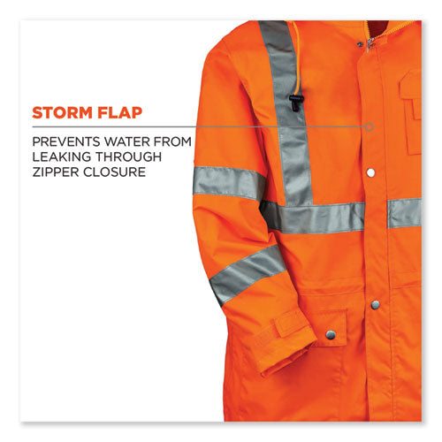 The GloWear 8365 Hi-Vis Rain Jacket is a Type R, Class 3 jacket that offers waterproof, breathable protection against the elements. Made with a breathable polyester shell that keeps water out while letting moisture escape to keep you cool and comfortable working in the worst conditions. This reflective rain jacket has 2 ANSI compliant 3M Scotchlite Reflective material on the chest and arms for added visibility at night or in low-light conditions. The inset hood can be tucked away when not needed. This waterproof work jacket offers comfortable protection against the elements for those working in road construction, utilities, construction, emergency response, airline, railway or survey crews.Note: This is a non-returnable item.