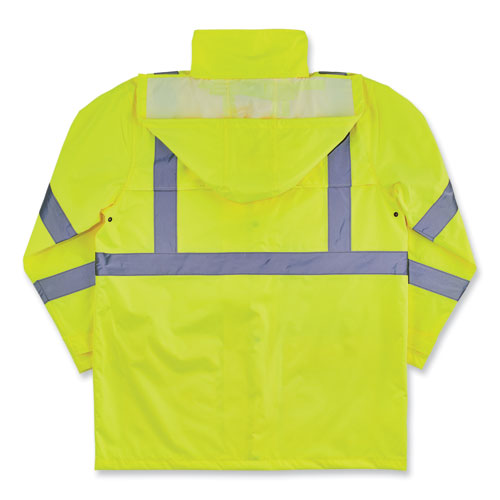 The GloWear 8366 Lightweight Hi-Vis Rain Jacket is designed with waterproof materials (150D polyester oxford with a polyurethane (PU) coating) and fully taped seams for reliable protection in the face of stormy weather. Compliant to ANSI/ISEA 107, Type R Class 3 with reflective tape for enhanced low-light visibility. This lightweight reflective rain jacket easily fits over workwear without sacrificing mobility. Fully taped seams are bonded to the jacket to keep water from sneaking in, while a vented cape-back allows heat and moisture to escape for added breathability. An attached drawstring hood can be stowed away when not needed. Reflective tape on chest and arms adds visibility at night or in low-light conditions. It's the perfect lightweight waterproof work jacket for those working in road construction, utilities, construction, emergency response, airline, railway or survey crews.Note: This is a non-returnable item.