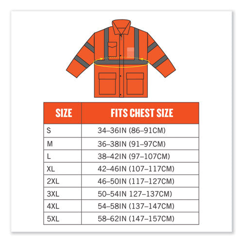 The GloWear 8366 Lightweight Hi-Vis Rain Jacket is designed with waterproof materials (150D polyester oxford with a polyurethane (PU) coating) and fully taped seams for reliable protection in the face of stormy weather. Compliant to ANSI/ISEA 107, Type R Class 3 with reflective tape for enhanced low-light visibility. This lightweight reflective rain jacket easily fits over workwear without sacrificing mobility. Fully taped seams are bonded to the jacket to keep water from sneaking in, while a vented cape-back allows heat and moisture to escape for added breathability. An attached drawstring hood can be stowed away when not needed. Reflective tape on chest and arms adds visibility at night or in low-light conditions. It's the perfect lightweight waterproof work jacket for those working in road construction, utilities, construction, emergency response, airline, railway or survey crews.Note: This is a non-returnable item.