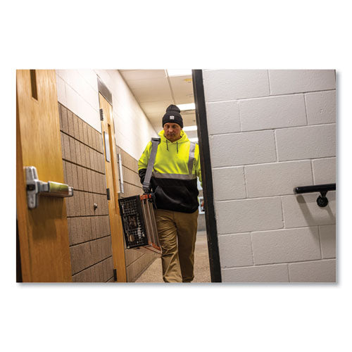 The GloWear 8373 Hi-Vis Pullover Hoodie with Black Bottom meets ANSI/ISEA 107-2015 Type R, Class 3 Standards for safety and is designed with high-quality 100% polyester polar fleece to provide conspicuity and warmth during chilly days. This safety sweatshirt has a pouch-style pocket great for additional hand warmth and storage. The bottom front and wrist sections of the sweatshirt are black to prevent a dirty look where it matters most. The contrasting high visibility yellow/lime color provides ultimate visibility. There is 2 ANSI-compliant silver reflective tape on the torso, shoulders and sleeves making it a great reflective hoodie to wear as night falls for effective visibility. The drawstring hood and elastic knit waistband and cuffs keep the heat in for all-day warmth throughout the workday. It is perfect for jobsites in high-traffic areas like road construction or anywhere that requires high visibility clothing.Note: This is a non-returnable item.