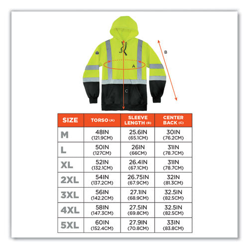 The GloWear 8373 Hi-Vis Pullover Hoodie with Black Bottom meets ANSI/ISEA 107-2015 Type R, Class 3 Standards for safety and is designed with high-quality 100% polyester polar fleece to provide conspicuity and warmth during chilly days. This safety sweatshirt has a pouch-style pocket great for additional hand warmth and storage. The bottom front and wrist sections of the sweatshirt are black to prevent a dirty look where it matters most. The contrasting high visibility yellow/lime color provides ultimate visibility. There is 2 ANSI-compliant silver reflective tape on the torso, shoulders and sleeves making it a great reflective hoodie to wear as night falls for effective visibility. The drawstring hood and elastic knit waistband and cuffs keep the heat in for all-day warmth throughout the workday. It is perfect for jobsites in high-traffic areas like road construction or anywhere that requires high visibility clothing.Note: This is a non-returnable item.