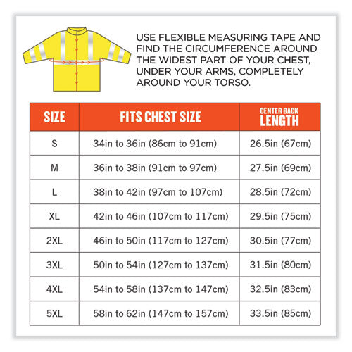 The GloWear 8377 Type R Class 3 Quilted Thermal High Visibility Jacket polyester outer shell with PU coating resists water and wind for warm and dry comfort all day. The black panels hide dirt and wear. Cuffs feature hook and loop straps to seal out the cold. Featuring two external front pockets for stashing gloves, phones and other gear plus an upper chest cell phone pocket. There are two mic tabs located on the upper chest of the jacket. This reflective coat is a Type R Class 3 garment and features 2" ANSI-compliant reflective stripes for nighttime visibility. Type R Class 3 garments feature more fluorescent background material and retroreflective material than other classes, to ensure maximum visibility and safety in all conditions.Note: This is a non-returnable item.