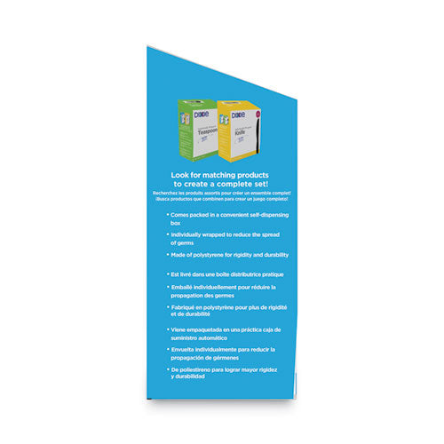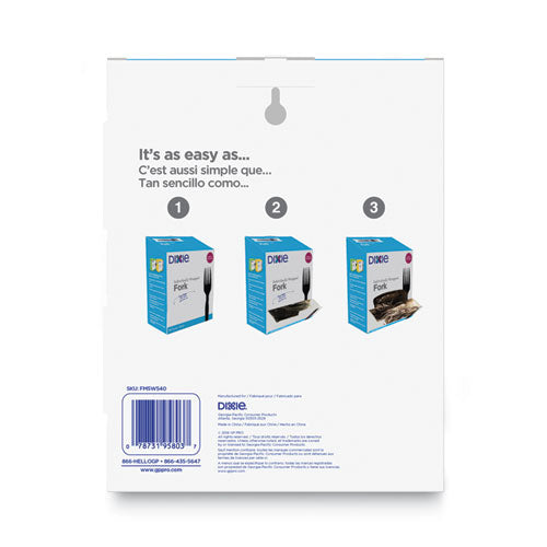 The Dixie® Medium-Weight Polystyrene Disposable Plastic Cutlery Grab-n-Go® lets you get rid of those messy, germ-collecting and wasteful open cutlery containers and replace them with individually wrapped forks in organized self-dispensing boxes. Dixie® Grab-n-Go® cutlery makes being well stocked super easy. The portable, disposable, easy-store boxes convert directly into quick-grab displays. Just open the box and put it on the counter (really). Grab-n-Go® cutlery puts a stay-well spin on break time. Each piece of the Dixie® plastic cutlery is protected by its own plastic covering, so the only person who touches it is the person who uses it. That's called good hygiene. These medium-weight individually wrapped plastic cutlery are great for most foods; perfect for office breakrooms, restaurants and more.
