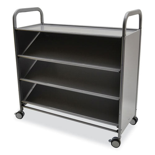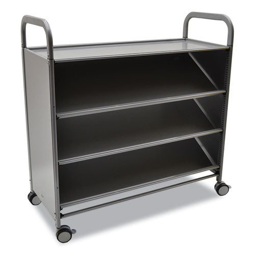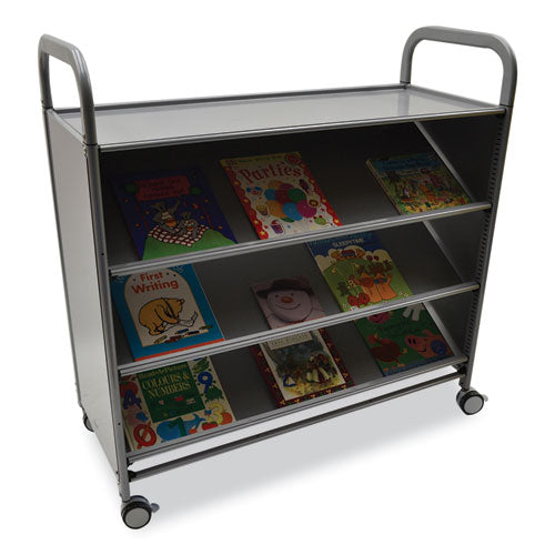 Part of the flexible Callero range, the Callero Plus Tilted Shelf Trolley is ideal for storing, transporting and displaying literature in a way that encourages independent and collaborative learning, making it the perfect addition to any library or literacy corner. Its triple-wide format boasts a standard flat shelf on top and three tilted shelves, all supported by specialty crossbars, below. The combination of flat and tilted shelves allows you to display books, special signage, custom-print materials and even artwork attractively. Durable steel frame is enclosed on the sides, and the trolley is completely free of sharp corners and edges, making it ideal for students of all ages—from Pre-K through adult learning. Ergonomic loop handles and smooth-rolling casters (two locking) make it easy to maneuver either down the hall or fully across campus. Four included glides also give you the option of switching between static and mobile use depending on how your needs change from one academic year to the next.Package Includes: (2) Locking Swivel Casters; (2) Non-Locking Swivel Casters; (4) GlidesNote: This is a non-returnable item.