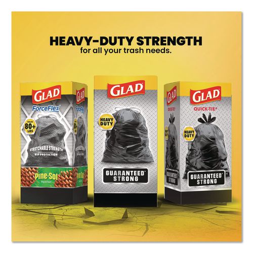 Trust Glad® extra strong trash bags for all your toughest jobs, indoors or outdoors. These heavy-duty trash bags are guaranteed strong to handle your biggest projects inside and outside the home. Prevent rips and tears with Glad's unique design, allowing the bag to stretch at top while reinforced bands through middle contain bulky trash. The strong 3-ply drawstring grips the can so the bag stays in place and allows you to easily close the fullest bag when you're ready to take it out. You can count on these bags to contain your messiest trash. Glad® garbage bags work as hard as you do to maintain a clean and active home, designed to handle your kitchen trash and tackle indoor and outdoor activities. Take on the trash and all your tough jobs with the confidence of Glad®.