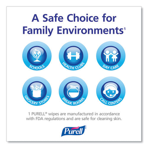 Convenient, disposable wipes from a canister kill 99.99% of common germs that may cause illness with their alcohol and PURELL combo. Fragrance- and dye-free formula leaves no sticky residue on hands. Nonlinting, durable and textured. Meets FDA requirements for Food Code compliance.