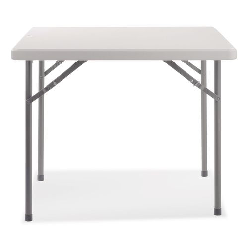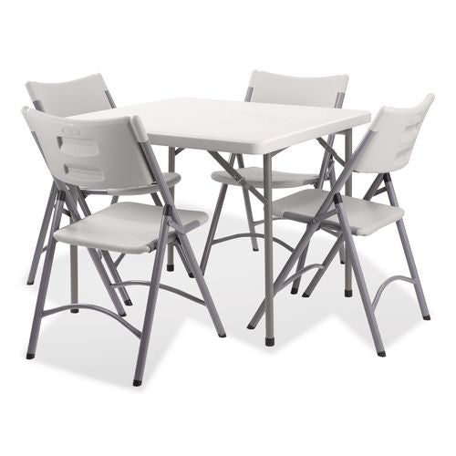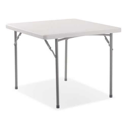Our BT3636 square blow-molded plastic folding table is the perfect solution for home, office, picnic and cafeteria use. Suitable for indoor or outdoor in any application that calls for affordable, lightweight, weather-resistant and highly durable folding tables. Their lightly textured design keeps them scratch-resistant yet still enables a surface smooth enough for writing. The plastic tabletop is heat-resistant up to 212ş F and designed with a non-bowing eggshell structure for fortification to hold up to 500 lbs of distributed weight! Paired with our 600 Series blow-molded, resin-plastic folding chairs featuring a heavy-duty, powder-coated 19-gauge tubular frame and a large, contoured seat and backrest for your comfort. Two cross braces both in front and in back for added support. V-tip stability plugs provide added reinforcement at the frame's junction and replaceable glides prevent floor damage.Package Includes: (4) Folding Chairs; (1) 36" x 36" Folding TableNote: This is a non-returnable item.