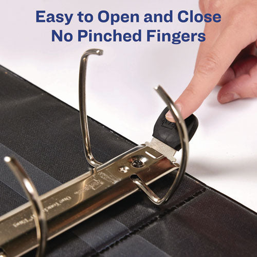 Heavy-duty binders for extended use. Tear-resistant DuraHinge® design is stronger and lasts longer. DuraEdge feature makes the sides and top more pliable, providing greater split resistance. Deep texture film offers a smoother finish and features a linen pattern for a high-quality look and feel. Four clear, interior pockets provide extra storage space. Wider front and back panels fully cover standard dividers and sheet protectors. One Touch slant rings open with ease, keep pages secure and have a higher page capacity compared to the same size round rings. Pages lie flat with back-mounted rings for a clean spine. Binders are made out of heavy-duty, non-stick poly material and won't lift ink or toner off printed pages.