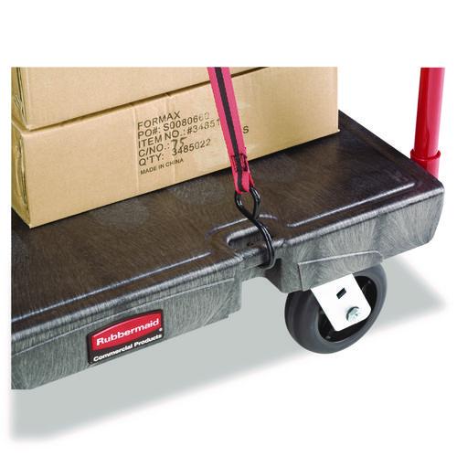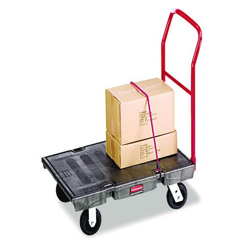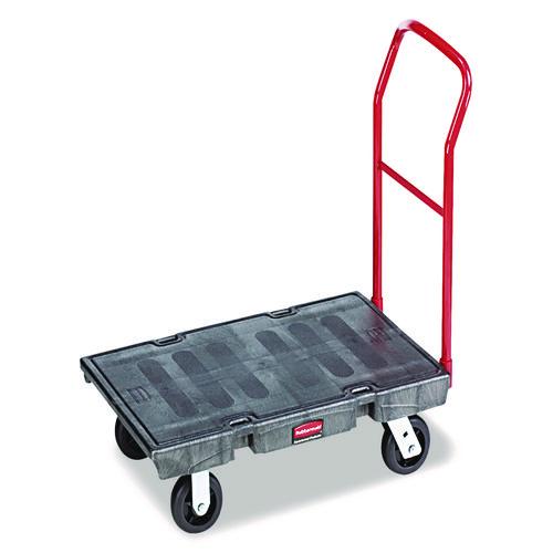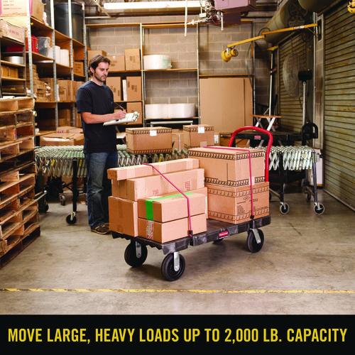 The Rubbermaid Commercial Heavy-Duty Platform Truck is constructed from Duramold resin and metal composite for durability and strength. The platform truck cart has a 2,000-pound capacity. Featuring molded-in tie-down slots and a textured surface to keep loads secure during transport. The platform cart has 2 fixed casters and 2 swivel casters to improve maneuverability.