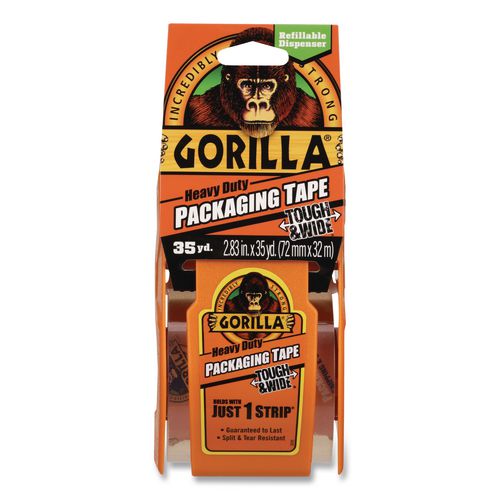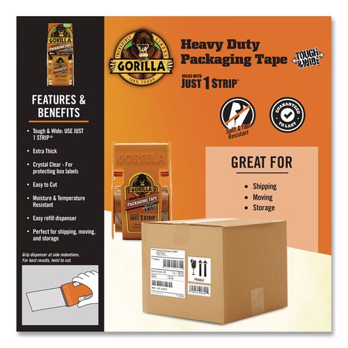 Gorilla® Packaging Tape Tough & Wide provides the ultimate solution for moving, shipping and storing. This adhesive tape offers heavy duty strength and durability. The crystal clear packing tape is moisture and temperature resistant, and at nearly 3 wide you can seal boxes with just one strip. With its wider tape construction, easy-to-grip dispenser, and problem-free tear, this tough tape is simpler to use than other packaging tapes. Plus, its easy-to-refill dispenser lets you get the job done in no time. Use Gorilla® 6030402 refill rolls.