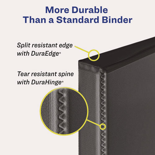 Heavy-Duty view binder with one touch EZD rings is perfect for long-term, regular use. Tear-resistant DuraHinge design is stronger and lasts longer. DuraEdge feature makes the sides and top more pliable, providing greater split resistance. Deep-textured film offers a smoother finish and features a linen pattern for a high-quality look and feel. Clear cover and spine for easy customization. Four clear, interior pockets provide extra storage space. Wider front and back panels fully cover standard dividers and sheet protectors. One touch EZD rings provide easy access and have a higher page capacity when compared to the same size round rings. Customize the cover with free, easy-to-use templates and designs at Avery Design & Print online.