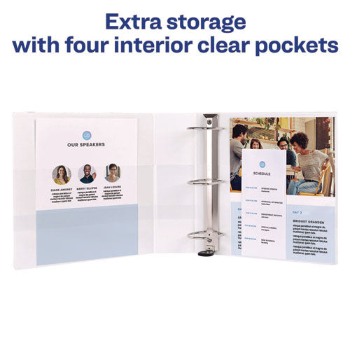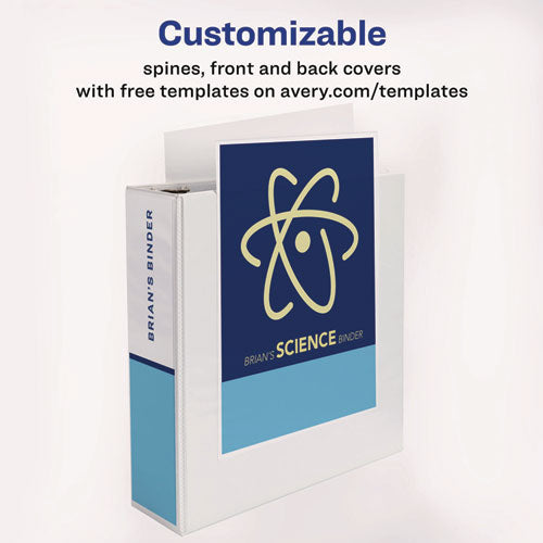 Heavy-Duty view binder with one touch EZD rings is perfect for long-term, regular use. Tear-resistant DuraHinge design is stronger and lasts longer. DuraEdge feature makes the sides and top more pliable, providing greater split resistance. Deep-textured film offers a smoother finish and features a linen pattern for a high-quality look and feel. Clear cover and spine for easy customization. Four clear, interior pockets provide extra storage space. Wider front and back panels fully cover standard dividers and sheet protectors. One touch EZD rings provide easy access and have a higher page capacity when compared to the same size round rings. Customize the cover with free, easy-to-use templates and designs at Avery Design & Print online.