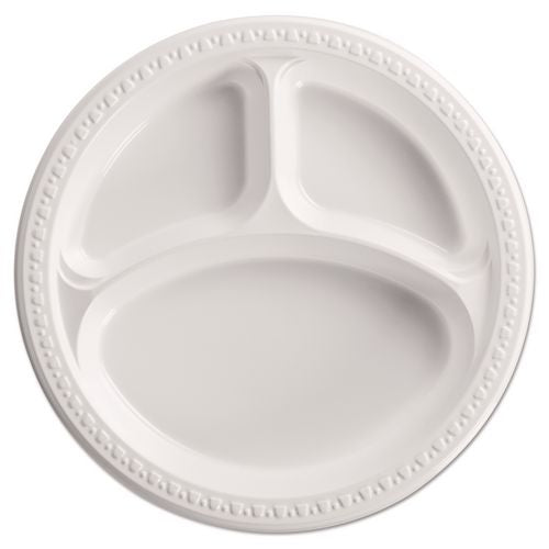 Premium-grade dinnerware provides superior strength and durability. Decorative, raised-rim border features a tasteful, contemporary design. Gloss-finished heavyweight plastic ensures rigid, cut- and leak-proof performance. Nesting, stackable pieces help you conserve storage space.