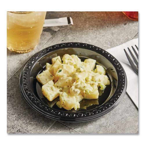 Premium-grade dinnerware provides superior strength and durability. Decorative, raised-rim border features a tasteful, contemporary design. Gloss-finished heavyweight plastic ensures rigid, cut- and leak-proof performance. Nesting, stackable pieces help you conserve storage space.