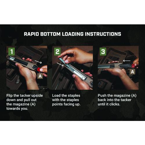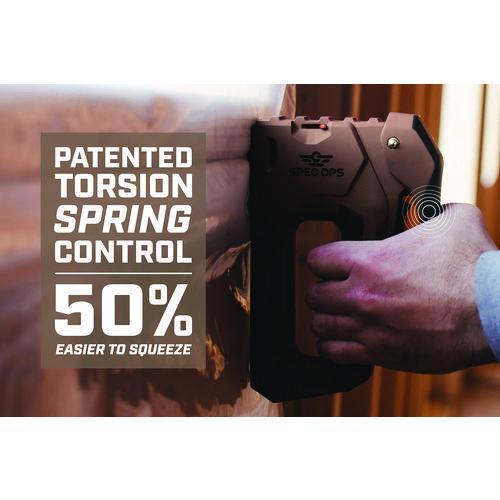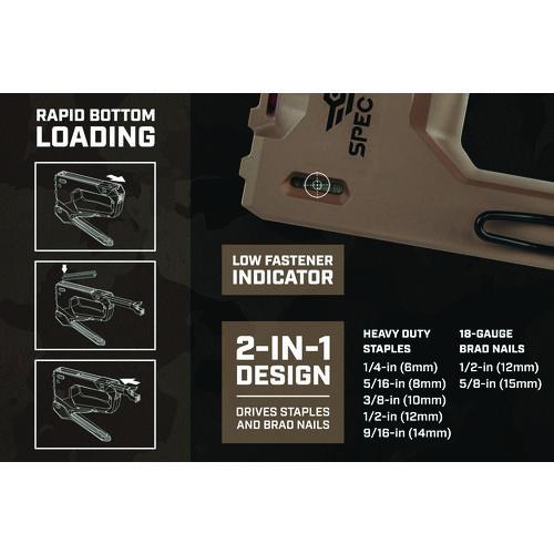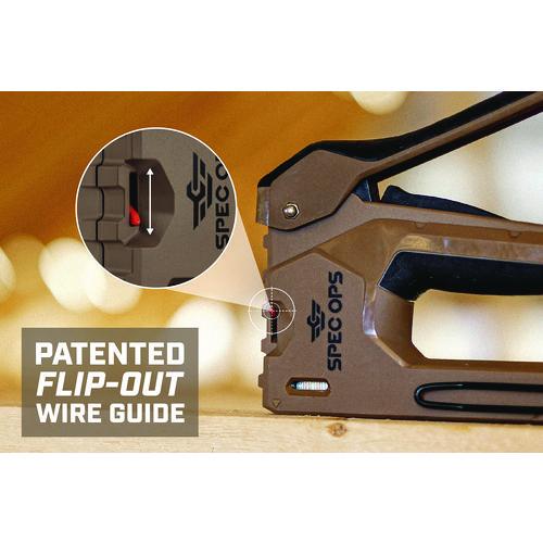 The 2-in-1 heavy-duty staple gun/brad nailer features Spec Ops patented Torsion Spring Technology for up to 50% easier squeezing that reduces hand fatigue and increases accuracy. Up to 25% lighter design with a military grade composite housing, this staple gun is light on the belt yet delivers extreme staple driving power. With a patented, flip-out wire guide, this hand stapler allows for precision stapling over cables and includes a low fastener indicator for added convenience. Utilizes heavy duty, T50 style staples and brads. The all-metal, reversible belt hook is designed for left and right-hand access.