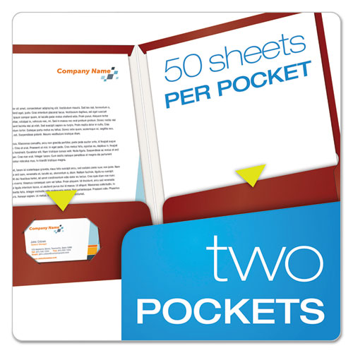 Bright, laminated high-gloss covers get attention. Die-cut business card holder on inside front cover keeps contact information at hand. For 11 x 8.5 sheets. Holds up to 100 sheets (50 per pocket).