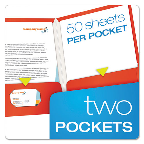Bright, laminated high-gloss covers get attention. Die-cut business card holder on inside front cover keeps contact information at hand. For 11 x 8.5 sheets. Holds up to 100 sheets (50 per pocket).