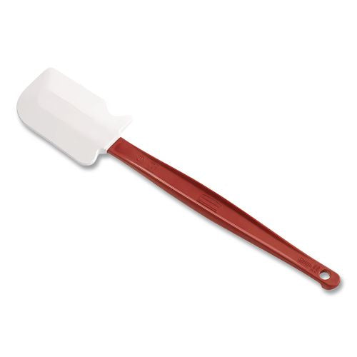 The Rubbermaid Commercial High Heat Spatula is an all-purpose scraper ideal for use in any industrial-size kitchen. This rubber spatula has a red nylon handle with white silicone blade. The scraper resists heat up to 500 degrees Fahrenheit (260 degrees Celsius) and is stain resistant and will not scratch cookware. Commercial dishwasher safe. This rubber spatula is certified to National Sanitation Foundation (NSF) standards for food safety.