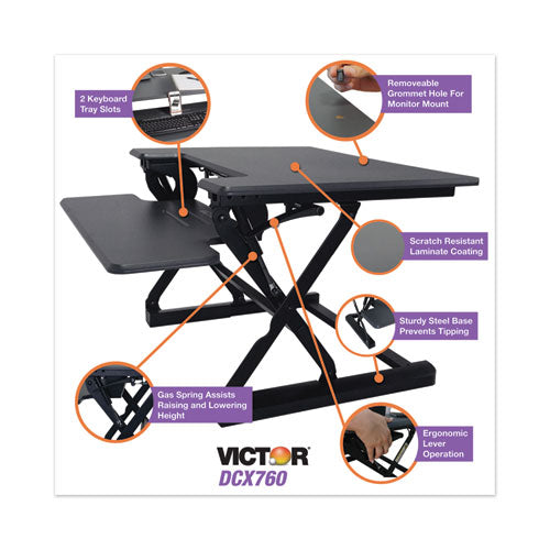 Transforms any standard sit-down desk into a sitting or standing desk. It sits on top of your current desk or table and does not require clamping or attachment of any kind. Simply go from sitting to standing with an easy squeeze of the lever handles on each side of the work surface. Perfect for any environment, it can be used in the home, professional office or industrial work places. The large, deep desk surface is accompanied by a wide and deep keyboard tray. Provides an ergonomic working position for users of varied heights. Gas spring system allows for smooth and stable height adjustment. Sleek wood construction and durable, scratch-resistant laminate coating will provide years of use with a modern style. Through-hole at rear of upper work surface accommodates monitor mount. Clamp-style monitor mounts can also be used, as the metal frame does not interfere with attachment and placement. Monitor mount sold separately.Package Includes: Assembly Hardware; Assembly Instructions; Assembly Tools