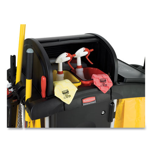 The Rubbermaid Commercial High Security Utility Cart is specially designed for cleaning healthcare facilities and more. These utility carts feature Lock 'N Go bucket attachments and locking cabinet doors on both sides of the service cart. Made from easy-to-clean, non-rusting aluminum and structural web plastic construction, it is designed for use with all Rubbermaid Commercial Microfiber Products. The utility cart includes a large 7-1/4 cubic foot locking cabinet area, rubber tool grips to hold handles upright, 4-inch quiet casters and 8-inch wheels, comfort grip handles, 2 removable 10 quart disinfecting caddies, a lobby dust pan/vacuum holder and 4 hooks to hold up to 4 safety signs. These utility carts are Joint Commission-compliant (JCAHO) to meet Environment of Care Standard 3.10.3 with locking doors and hood.Package Includes: (1) PVC-Lined Fabric Bag