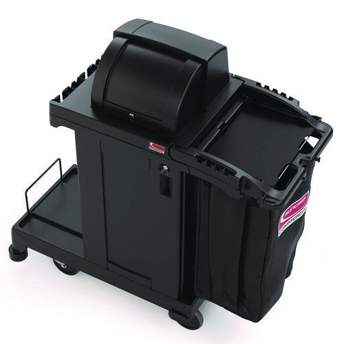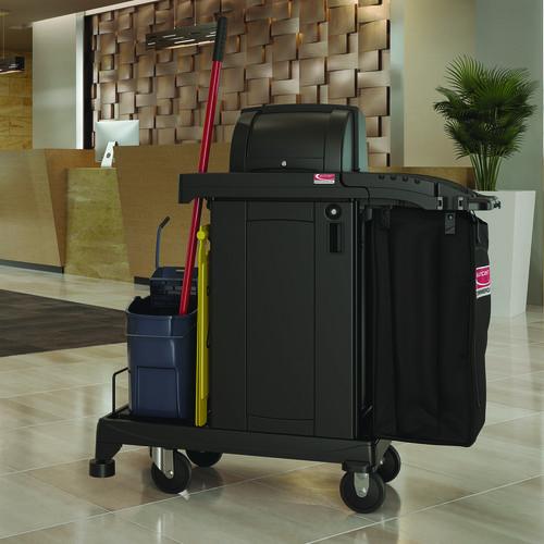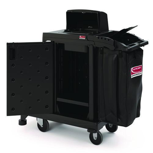 The Suncast Commercial high security cleaning cart is a very secure cart with a variety of storage and organization options. With a lockable hood and lockable front door, you can store your important items that may need to stay out of sight and secure, while getting your duties done. The one large bin and two small bins provide a additional storage that may need to be easily accessible. The included spacious standard bag can be used for collecting laundry or linens, and the added lid will keep these items out of sight. This is the perfect cart for all of your janitorial and housekeeping needs.Package Includes: (1) Large Bin; (2) Small Bins; Standard Laundry/Linen Bag with Lid