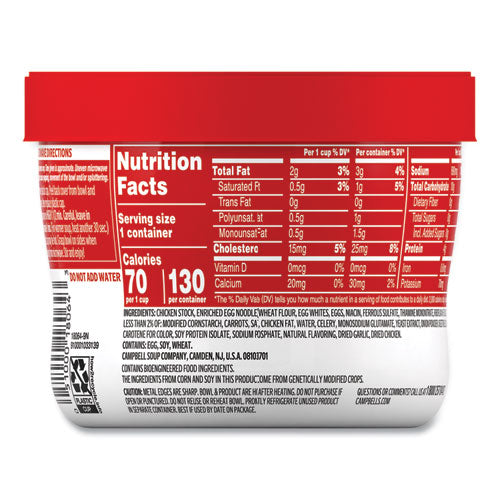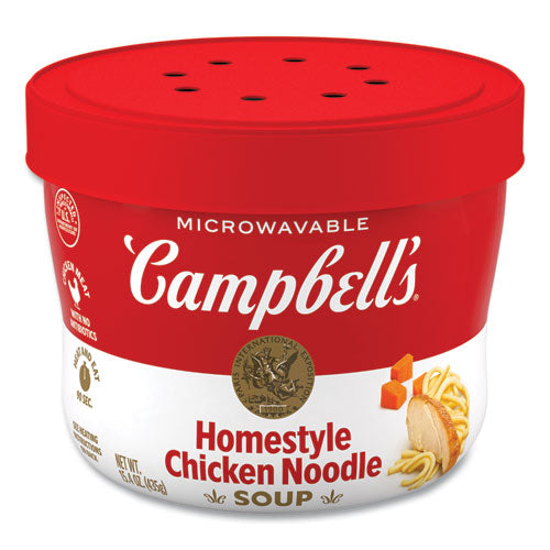 Take this twist on classic flavors you know and love on the road with a microwavable bowl of Campbell's Homestyle Chicken Noodle Soup. Every spoonful of this comforting chicken soup is crafted with delicious ingredients you grew up on. The savory taste of seasoned chicken broth, egg noodles, vegetables and tender chicken meat with no antibiotics makes this soup a delicious and nostalgic choice anytime, anywhere. This chicken soup is made without high fructose corn syrup for a snack you can feel good about. Just pop off the cap, peel back the cover, replace the cap and microwave for one minute and 30 seconds. Let this easy to microwave soup sit for one minute and enjoy! Take this instant soup on the go for an easy, portable snack, appetizer or side dish for a delicious lunch.Note: This is a non-returnable item.