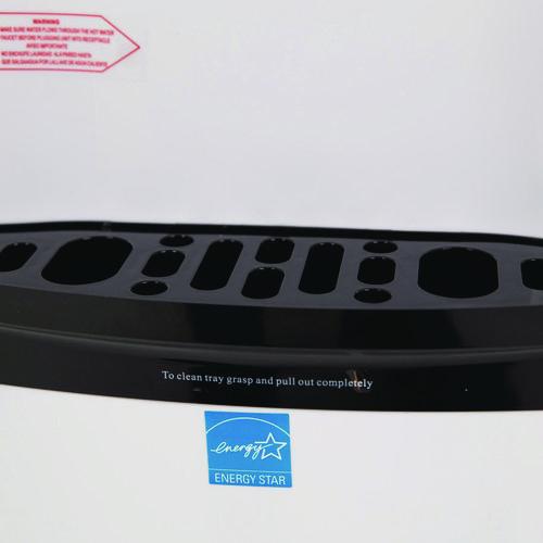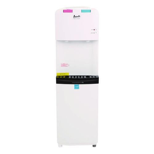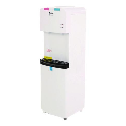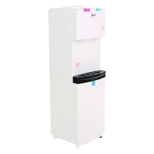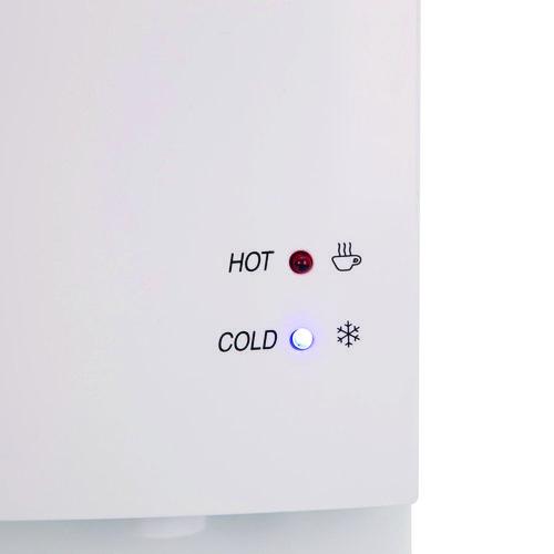 Holds three or five gallon water bottles (not included). Large easy access dispenser area to accommodate pitcher and water bottles. Push-button faucets for cold and hot water. Child safety guard on hot water faucet. LED light indicators. Lightweight durable plastic body. Stainless steel reservoir for water purity.