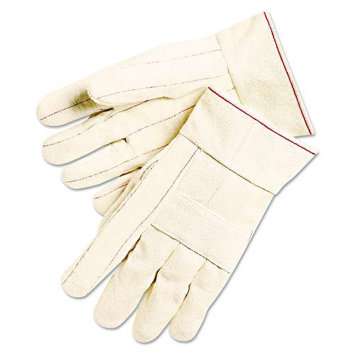 Use Hot Mill Heat-Resistant Work Gloves from MCR™ Safety. These gloves are ideal for handling low- to moderate-temperature objects. Regular-weight, 24-ounce cotton construction, clute cut, knuckle strap and soft liner provide reliable protection with breathable wearing comfort. Extended, 2.5-inch band-top cuff makes them easy to pull off when needed.Note: This is a non-returnable item.