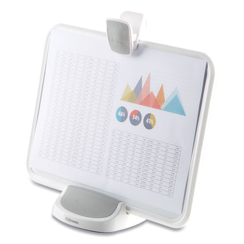 Innovative 3-in-1 design: document holder, dry-erase board and clipboard. Places documents in a more comfortable viewing position to help reduce neck, shoulder and eye strain. Allows portrait and landscape orientation. Dry erase board for quick notes or reminders, while copy clip holds up to 100 sheets of letter-sized paper.