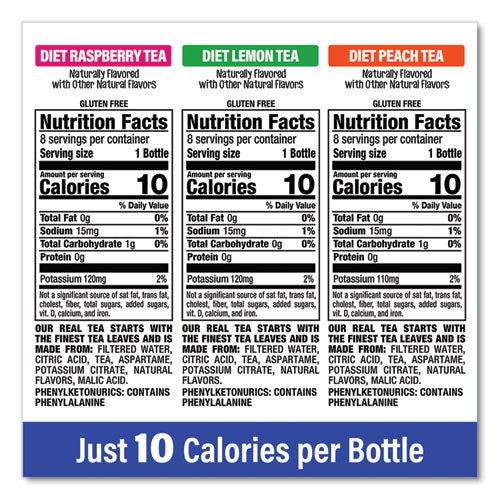 Life's full of decisions, but you don't have to make one here. We've combined your favorite Diet Snapple Teas in one convenient variety pack: Diet Peach Tea, Diet Lemon Tea and Diet Raspberry Tea. Now you can choose the Diet Snapple flavor you want when you want it. That's what we've been doing at Snapple ever since we were a small brand created by three health-food store owners in the New York area. We began by selling our apple juice to health clubs in 1973. Diversifying our flavor portfolio throughout the 80s into teas, fruit juices and lemonades, Snapple went national in the early 90s. Now you can find us in all 50 states across the country. It's also gluten-free and all natural so each bottle is free of artificial sweeteners and flavors. They say variety is the spice of life, so go ahead and take a sip of Diet Peach Tea, Diet Lemon Tea and Diet Raspberry Tea. Enjoy the great taste of Diet Snapple Tea any time of day knowing you're getting a great-tasting drink made with natural, high-quality ingredients.Note: This is a non-returnable item.