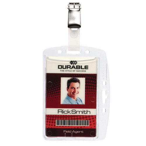 The single-card Secure Badge Holder from DURABLE® is designed to keep one ID card or magnetic pass secure while offering maximum convenience and protection. Ideal for schools, healthcare facilities, offices, government buildings, warehouses/manufacturing plants, banks, hotels, and conferences, this badge holder ensures that your identification is always easily accessible and secure. The rotating strap clip features a protective plastic fitting that attaches easily to clothes (including, belts, pockets, scrubs neckline, waistline, or your current lanyard) without causing any damage. This thoughtful design element makes the badge holder suitable for any attire, like professional office wear or work uniforms. The secure attachment ensures that your ID stays in place, even during active or busy days. Crafted from premium acrylic, the enclosed shell-style badge holder offers superior protection and durability. The high-quality material is resistant to wear and tear, ensuring that your badge holder remains in excellent condition even with frequent use. This durability is essential for environments where ID cards are handled multiple times a day, such as busy workplaces, manufacturing facilities, or large office buildings. The convenient thumb slot allows for quick and hassle-free removal of your card with a single swipe. This design enables easy one-handed scanning without the need to fully remove the card from the holder, saving time and effort in situations where swift access is needed, such as at security checkpoints or entry gates. The Secure Badge Holder can be used both vertically and horizontally, depending on your ID card layout. This flexibility ensures that no matter how your badge is designed, the holder will fit perfectly, making it a practical choice anywhere you need to keep essential cards accessible and visible.