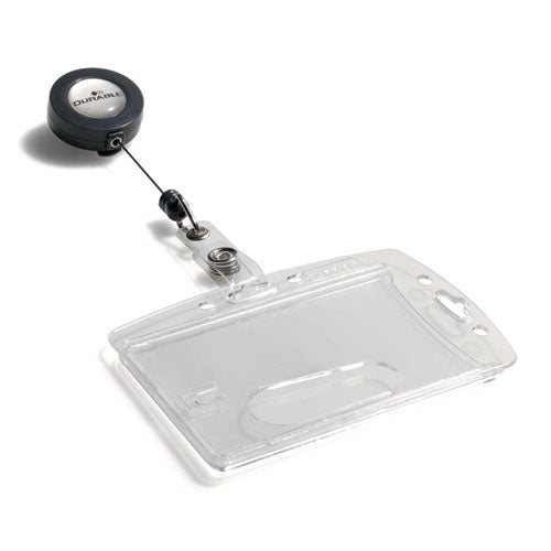 The single-card Secure Badge Holder with retractable reel from DURABLE® is designed to keep one ID card or magnetic pass secure while offering maximum convenience and protection. Ideal for schools, healthcare facilities, offices, government buildings, warehouses/manufacturing plants, banks, hotels, and conferences, this badge holder ensures that your identification is always easily accessible and secure. The retractable reel has a metal clip on the back that attaches easily to clothes (including, belts, pockets, scrubs neckline, waistline, or to your current lanyard) without causing any damage. This thoughtful design element makes the badge holder suitable for any attire, like professional office wear or work uniforms. The secure attachment ensures that your ID stays in place, even during active or busy days. Crafted from premium acrylic, the enclosed shell-style badge holder offers superior protection and durability. The high-quality material is resistant to wear and tear, ensuring that your badge holder remains in excellent condition even with frequent use. This durability is essential for environments where ID cards are handled multiple times a day, such as busy workplaces, manufacturing facilities, or large office buildings. The convenient thumb slot allows for quick and hassle-free removal of your card with a single swipe. This design enables easy one-handed scanning without the need to fully remove the card from the holder, saving time and effort in situations where swift access is needed, such as at security checkpoints or entry gates. The Secure Badge Holder can be used both vertically and horizontally, depending on your ID card layout. This flexibility ensures that no matter how your badge is designed, the holder will fit perfectly, making it a practical choice anywhere you need to keep essential cards accessible and visible.