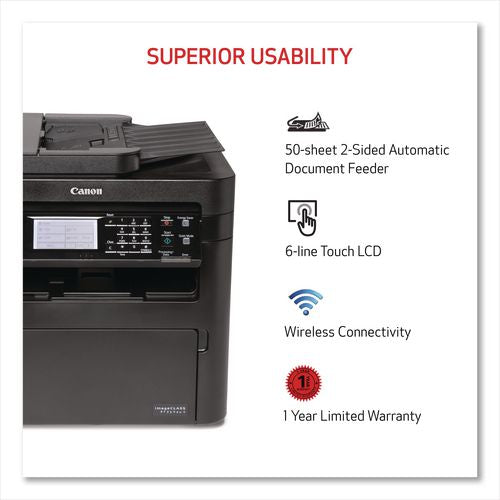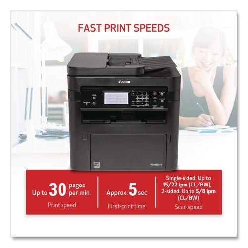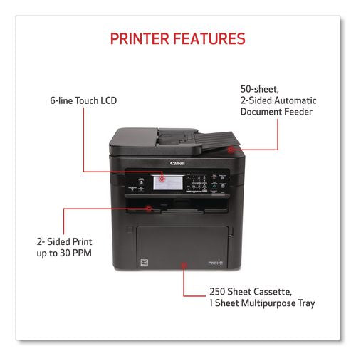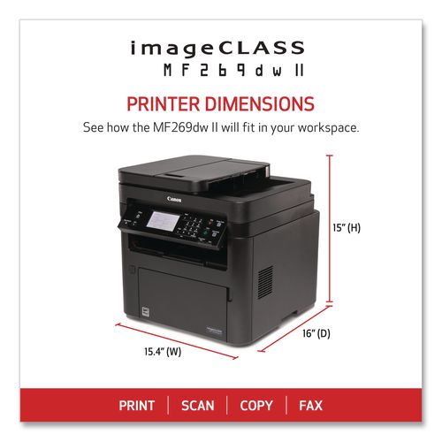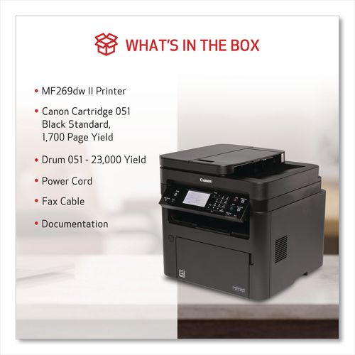 Upgrade your home office with the Canon® imageCLASS MF269dw II wireless black and white all-in-one laser printer, specially designed for small office environments requiring multifunctional capability and productivity. Experience endless possibilities with print, scan, copy, and fax functions, while enjoying swift printing speeds of up to 30 pages per minute. This high-performance 600 dpi printer supports various media types to accommodate your diverse printing needs. Stay connected effortlessly with wireless networking and simplify your printing tasks with mobile capabilities. The high-capacity toner option offers extended efficiency by limiting interruptions due to frequent toner replacements. With compatibility across Windows®, Mac® OS, and Chrome OS, the Canon® imageCLASS MF269dw II is the ultimate solution for enhancing your home office setup.Package Includes: Cartridge 051 Black; Drum 051; Power Cord; Fax Cable; Documentation