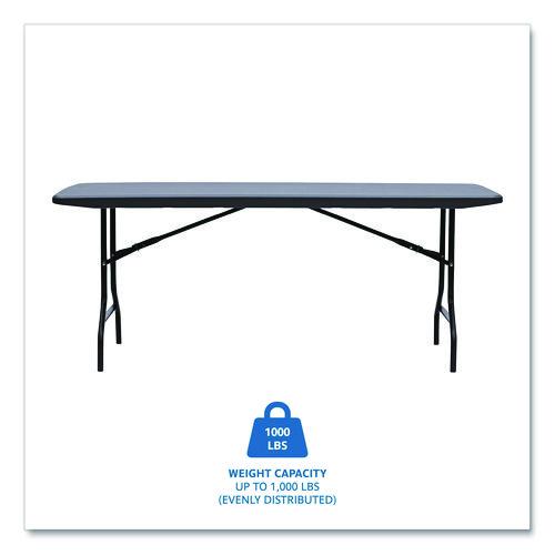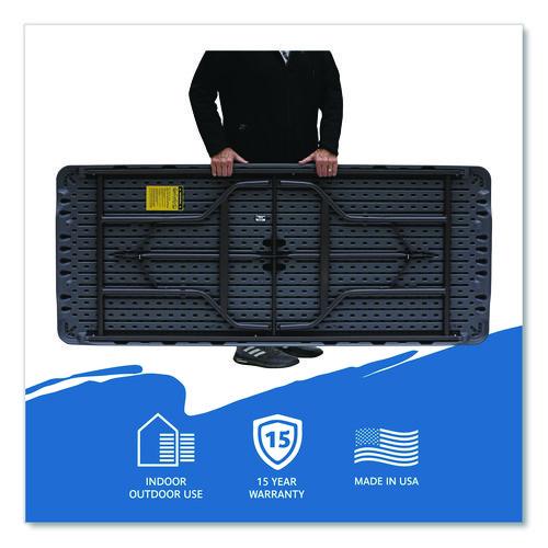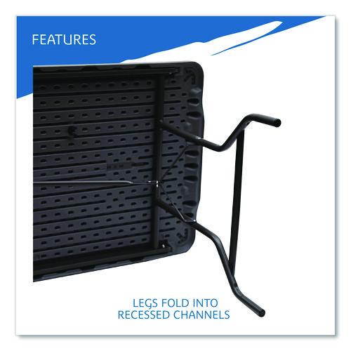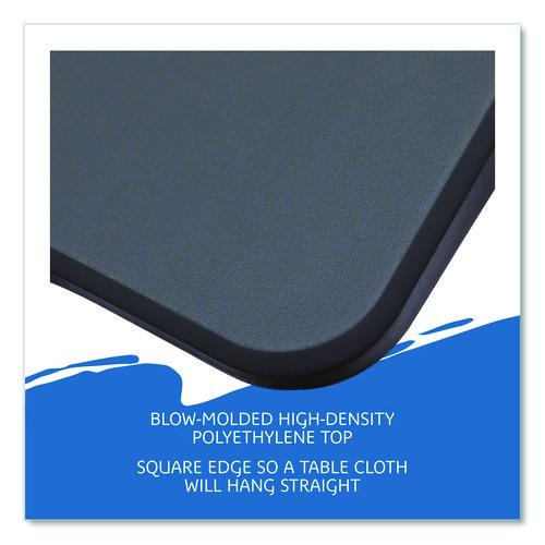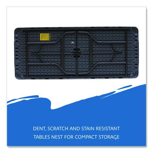 Contemporary in appearance and design, IndestrucTable® Commercial Folding Tables are designed for use indoors and out. Easy to set up, take down and transport, these lightweight tables are ideal for foodservice, school and office environments as well as at weddings, banquets and any number of special events. Dent- and scratch-resistant as well as surprisingly easy to clean, the blow-molded high-density polyethylene top features a square edge, so tablecloths can hang straight, ensuring a neat and tidy table-service appearance. Sturdy, powder-coated steel-tubing legs and an all-steel base provide a solid foundation to support anything from heavy merchandise displays to a full holiday feast. Convenient recessed channels for the legs allow the table to fold nearly flat for easy, compact storage. Rubber glides affixed to each leg help protect the finish on hard flooring.