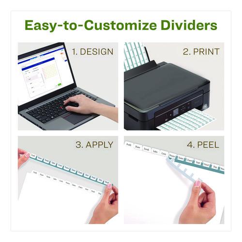 Whether you're coordinating a single project or multiple binder sets, these dividers let you to get it done quickly and easily, with professional results. The clear labels virtually disappear on the tabs, giving your dividers a clean, printed-on look. Save time with the Easy Apply strip that lets you label all the tabs at once, making it simple to create custom dividers right from your desktop. Just use the free templates from Avery Design & Print and you can personalize and print your Easy Apply tab labels in minutes. These dividers are the professional solution for all your organizational needs. For laser and inkjet printers.