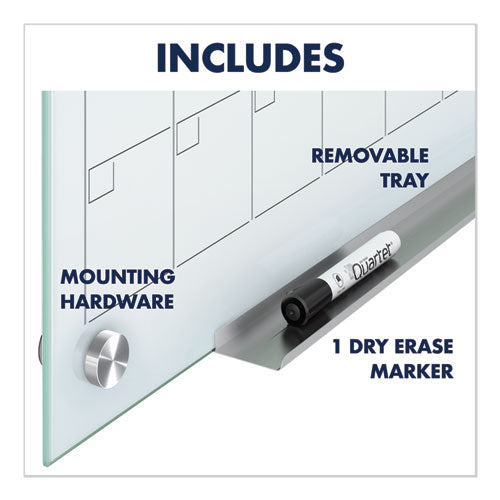 Tempered-glass, magnetic dry-erase calendar is highly durable. It provides smooth writing and erases cleanly after every use, without ghosting or staining. The frameless, one-month design is a good fit for any office. Write down appointments or post notes using magnets. Hardware is included for simple and secure wall mounting. Occasional cleaning is recommended for best performance. One marker and magnets included.Package Includes: (1) Quartet® Dry Erase Marker; (2) Rare-Earth High-Power Magnets; Mounting Kit