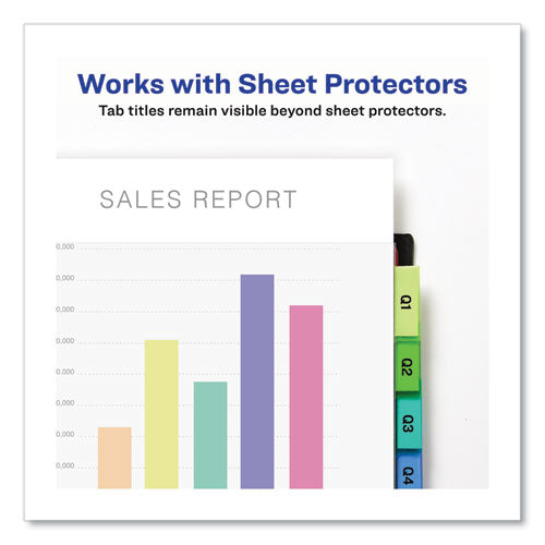 Strong organization and storage capabilities are yours with the help of these Big Tab Two-Pocket Insertable Plastic Dividers. Each divider features double plastic pockets, one on each side of the divider, to provide extra storage space for your important papers. The Big Tab design allows you to use larger fonts or more lines of text than on typical inserts for easier reading or more detailed labeling. Use a free template from Avery Design & Print to customize tabs titles onto the included label sheets using your computer and printer. The tabs' unique design keeps inserts from falling out, so your dividers stay securely labeled. Constructed with durable plastic, these dividers offer lasting organization in a big way. Handwrite or print inserts on laser and inkjet printers.