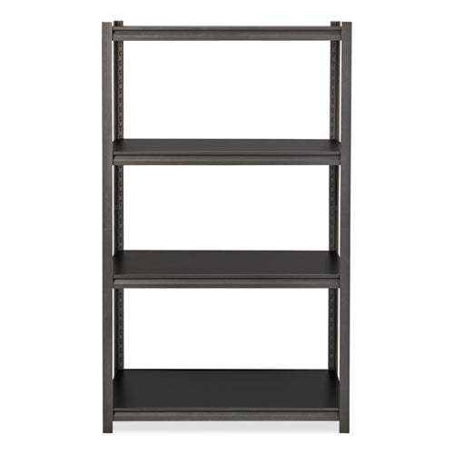 Iron Horse rivet shelving is designed for heavy-duty use. The boltless design allows for quick and easy assembly. The powder coated finish is rust resistant and durable. The Iron Horse® shelving unit can be assembled either horizontally or vertically, depending on your storage needs. Each unit includes black laminate decking. Steel four-shelf unit holds a total capacity of 3,200 lb evenly distributed. Assemble with a rubber mallet (not included) in less than 30 minutes. Shelving is made of heavy-duty riveted steel construction.Note: This is a non-returnable item.