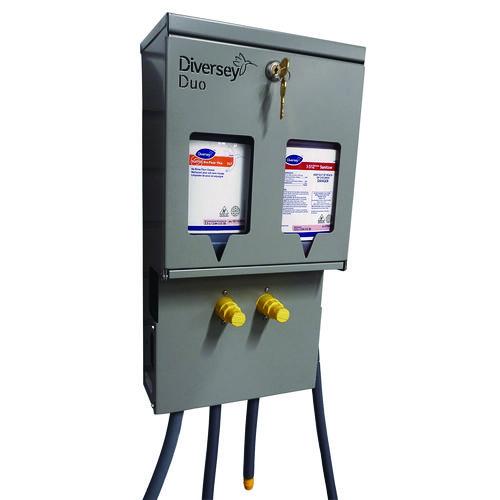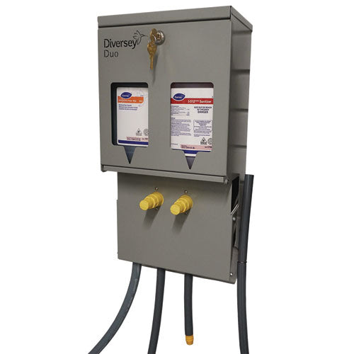Accurately dispenses two J-Fill® products and rinse water into spray bottles or buckets with a push of a button. Rugged stainless construction.