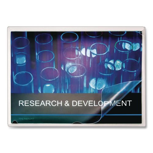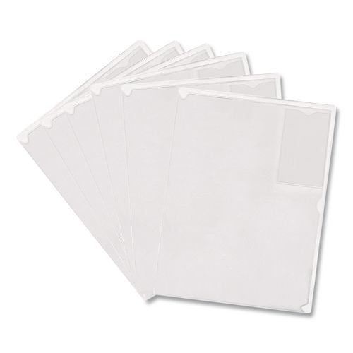 Transparent, polypropylene folder with an embossed grain finish. Sealed on left side and bottom for easy access. Thumb-notched at the right front with tear-resistant corners. See-through front is great for identifying contents at a glance.