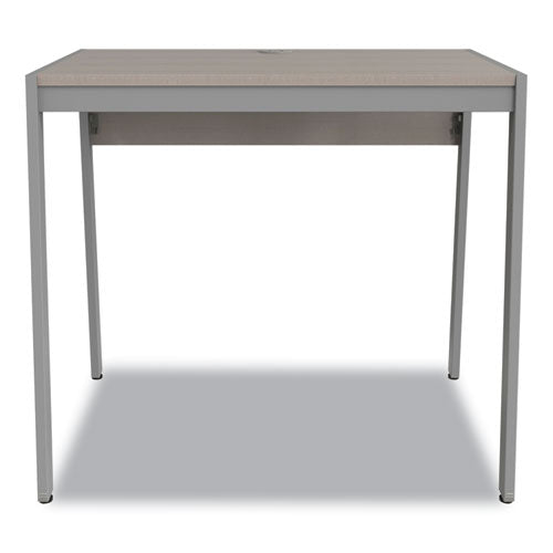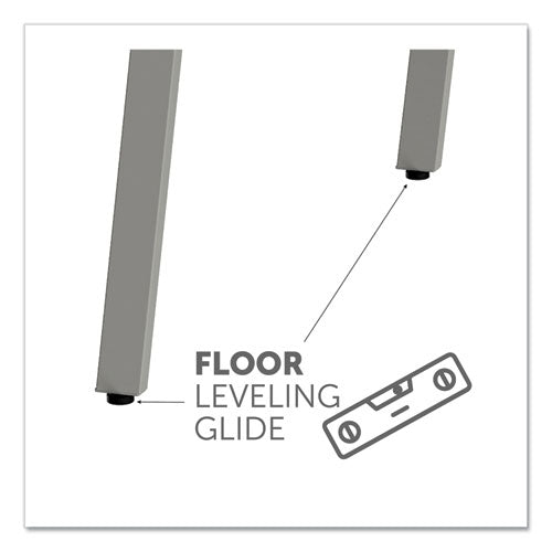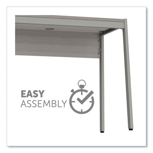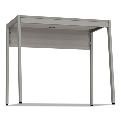 Open modern desk is perfect in small spaces. Quick, easy assembly with no tools required. Scratch- and stain-resistant woodgrain laminate top with grommet for wire management. Strong silver powder coated steel frame with modesty panel. Leveling glides adjust to accommodate uneven floors.