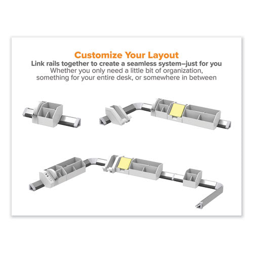 Get ready to do some major office organization with this 12-Piece Konnect™ Desktop Organizer and Cable Management Kit. Coming with three cord management rails that hide wires and dock accessories, this kit also includes a short and a wide storage bin. Holding pens, tacks, staples and more, they each come with dividers and lids to conceal messy clutter. The tape dispenser is slim and comes with office tape so you're ready to work. The sticky note holder displays and keeps business cards and sticky notes nearby. You also get a 3" x 3" pad of yellow sticky notes. Charge up with the power hub. It features one single outlet and two USB ports. The phone dock also features a USB charging port and safely docks your phone for easy viewing and use.Package Includes: (2) 12" Cord Management Rails; (1) 21.5" Cord Management Rail; (1) Sshort Storage Bin; (1) Wide Storage Bin; (1) Tape Dispenser; (1) Sticky Note Holder; (1) USB Phone Dock; (1) Power Hub; Mounting HardwareNote: This is a non-returnable item.