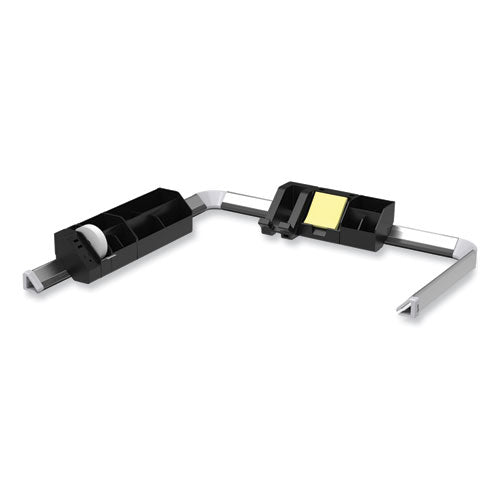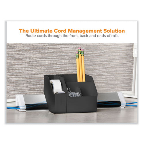 Jam-packed with all office organization essentials, this 14-piece Konnect™ Desk Organizer set transforms your office from no thanks to yes please! Dock any connected accessories to the three cord management rails, along with hiding pesky wires that no one wants to look at. The note/business card holder displays sticky notes for unique organization and comes with a yellow pad of sticky notes. The tape dispenser is an office must. It comes with a single roll of tape so you're off to a steady start. Have a lot of knick-knacks that need to be tucked away somewhere? The one long and two short storage bins do just that. They hold anything from highlighters to extra staples. They even come with modular dividers and removable lids! The power hub allows for easy charging of any device as it includes a power outlet and two USB charging ports. The phone dock safely houses your phone and also features a USB port.Package Includes: (1) 12" Cord Management Rail; (2) 21.5" Cord Management Rails; (2) Short Storage Bins; (1) Wide Storage Bin; (1) Tape Dispenser; (1) Sticky Note Holder; (1) USB Phone Dock; (1) Power Hub; Mounting HardwareNote: This is a non-returnable item.