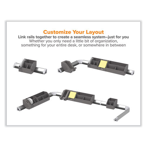 Jam-packed with all office organization essentials, this 14-piece Konnect™ Desk Organizer set transforms your office from no thanks to yes please! Dock any connected accessories to the three cord management rails, along with hiding pesky wires that no one wants to look at. The note/business card holder displays sticky notes for unique organization and comes with a yellow pad of sticky notes. The tape dispenser is an office must. It comes with a single roll of tape so you're off to a steady start. Have a lot of knick-knacks that need to be tucked away somewhere? The one long and two short storage bins do just that. They hold anything from highlighters to extra staples. They even come with modular dividers and removable lids! The power hub allows for easy charging of any device as it includes a power outlet and two USB charging ports. The phone dock safely houses your phone and also features a USB port.Package Includes: (1) 12" Cord Management Rail; (2) 21.5" Cord Management Rails; (2) Short Storage Bins; (1) Wide Storage Bin; (1) Tape Dispenser; (1) Sticky Note Holder; (1) USB Phone Dock; (1) Power Hub; Mounting HardwareNote: This is a non-returnable item.